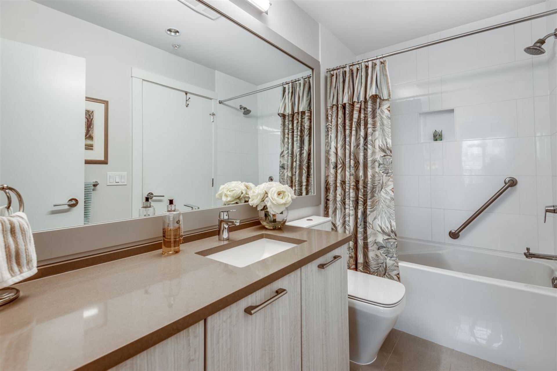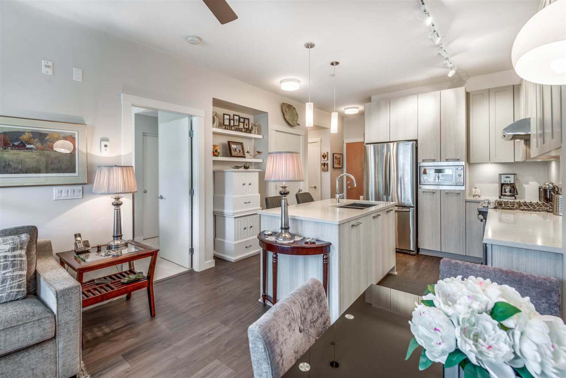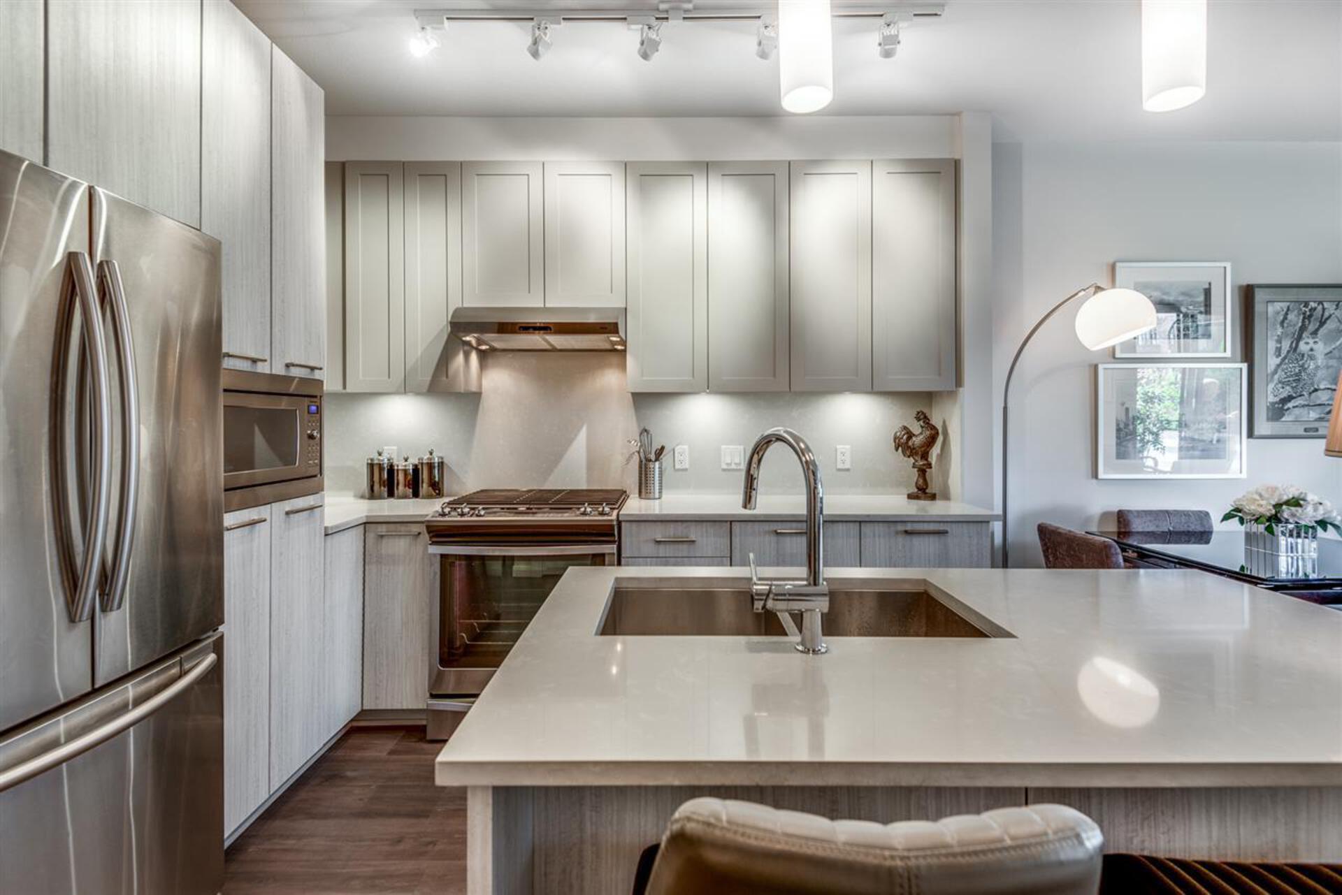 FIRST STREET WEST - Fabulous boutique building in the center of Lower Lonsdale. Rare 1 bed & flex home with generous patio and park like setting view. Great efficient layout with overheight 9’ ceilings and high-end finishing. Open concept kitchen with elegant 2 Tone Cabinetry, classic White Quartz countertops and Island, under cabinet lighting, soft-close doors & drawers, built in microwave, Stainless Steel appliances, 5 burner gas stove and oven. Bedroom offers a walk through closet, opening to the ensuite bathroom. Building offers main floor conference room, incredible Rooftop Amenity with Entertaining Lounge, Outdoor Patio, Community Gardens & City, Water & Mnt Views! Best Location- Nightmarket, restaurants, fitness & steps to transit. Parking + storage. Rentals & pets welcome!